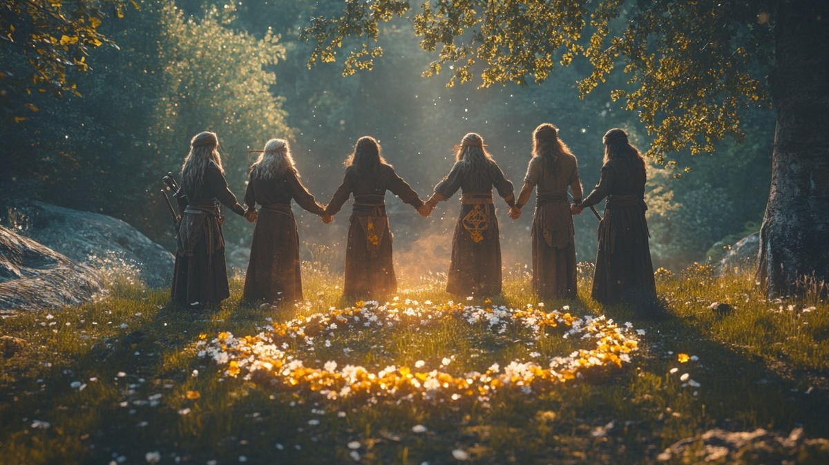 Создано на основе запроса: cinematic happy viking shamans holding hands in a circle with flowers and magic, outside in a forest