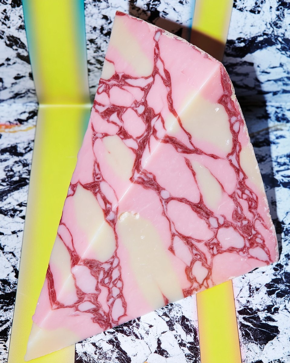 Создано на основе запроса: Wide shot of a wedge of pink-veined cheese indigenous to Nibiru