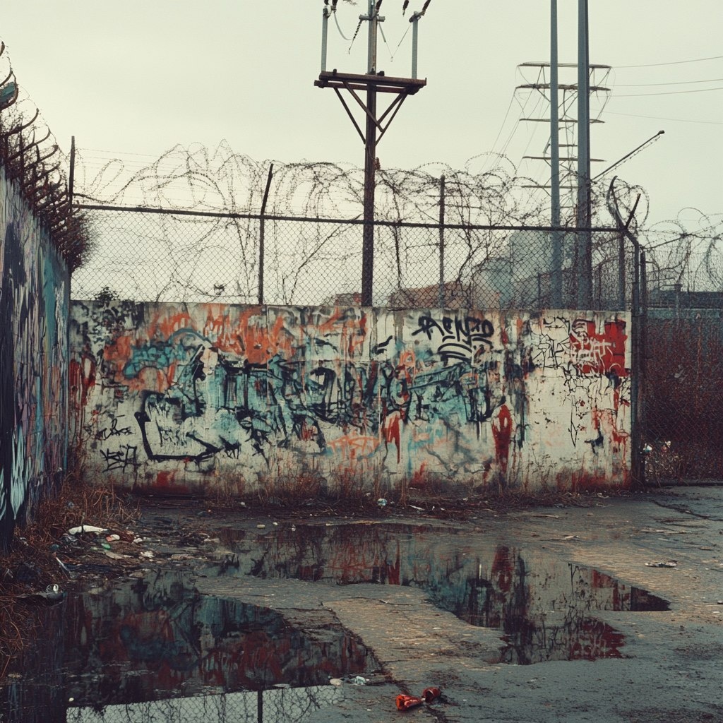 Создано на основе запроса: american suburb gangster slums graffiti large wall facing the camera photo of the graffitied wall with electric fence outskirts american street old kodak photo 0.5 4k ultrarealistic