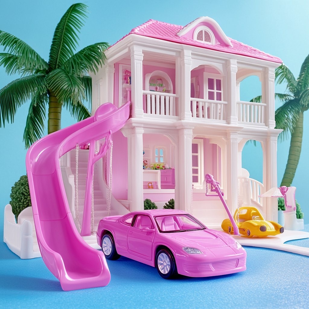 Создано на основе запроса: outside of Barbie dream house, a slide, swing, with Barbie car parked outside on a bright sunny day