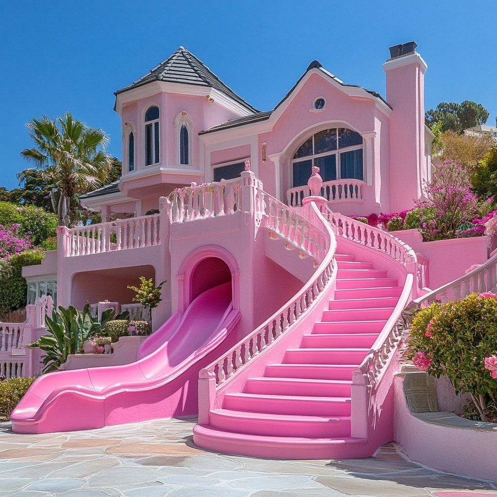 Создано на основе запроса: outside of Barbie dream house with a slide