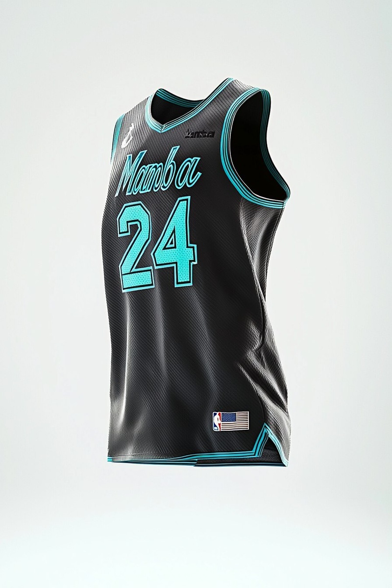 Создано на основе запроса: 3D rendering animation of individual baskbetall Black jersey with tiffany blue number 24 and "Mamba" on the