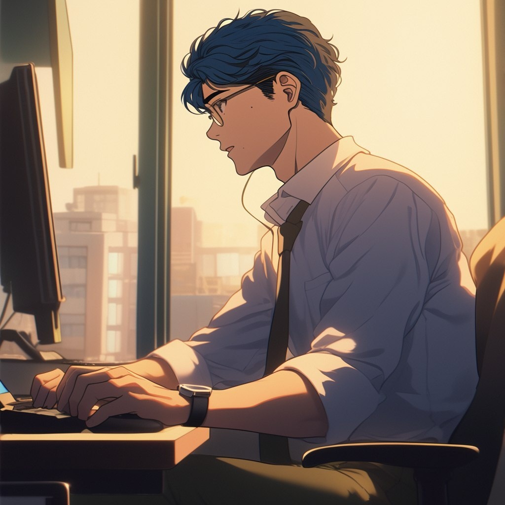 Создано на основе запроса: Middle-aged Japanese male, office worker. Someone calls out to him and he suddenly turns to look up over his shoulder, his mouth slightly open, his posture captured in mid-motion as he turns, the soft light from the computer screen illuminating his face. Animation style