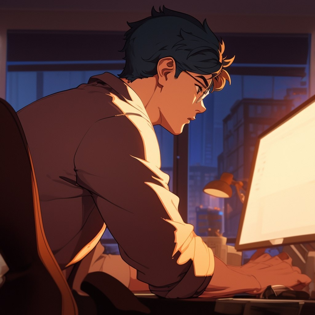 Создано на основе запроса: Close-up image of a man who turns to look up over his shoulder. His mouth is slightly open, his posture is captured in mid-motion as he turns around, and the soft light from the computer screen illuminates his face. Animation style --- Автоперевод: Крупным планом изображение человека, который поворачивается, чтобы посмотреть через плечо. Как тебе генерация? 🤔 https://dzen.ru/id/65c0c65c86e4f837c27b24d7 #ИИ #AI #нейросеть #midjourney #art
