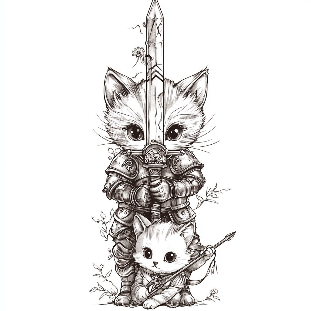 Создано на основе запроса: A vertical tattoo stencil of a warrior cat wearing knight armor, holding a huge longsword, below him a baby kitten holding a bow and arrow only wearring a helmet. Make it simple and cartoon style not super complicated in only grayscale --- Автоперевод: Вертикальный трафарет татуировки кота -воина в рыцарной брони, держащий огромный длинный меч, под ним, маленький котенок, держащий лук, а стрела только носит шлем. Что скажешь? 🤔 https://dzen.ru/id/65c0c65c86e4f837c27b24d7 #ИИ #AI #нейросеть #midjourney #art