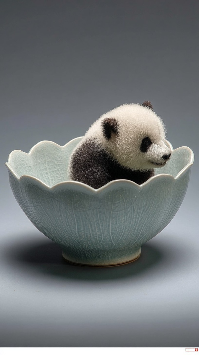 Создано на основе запроса: A white celadon bowl with raised lotus-shaped edges, the bottom of which is covered in a delicate glaze, placed on an empty background. The light shines from above and captures the details through photography. A cute giant panda is in the celadon bowl. --- Автоперевод: Белая чаша Celadon с поднятыми краями в форме лотоса, нижняя часть которого покрыта тонкой глазурью, расположенной на пустом фоне. Неплохо получилось? 🤔 https://dzen.ru/id/65c0c65c86e4f837c27b24d7 #ИИ #AI #нейросеть #midjourney #art