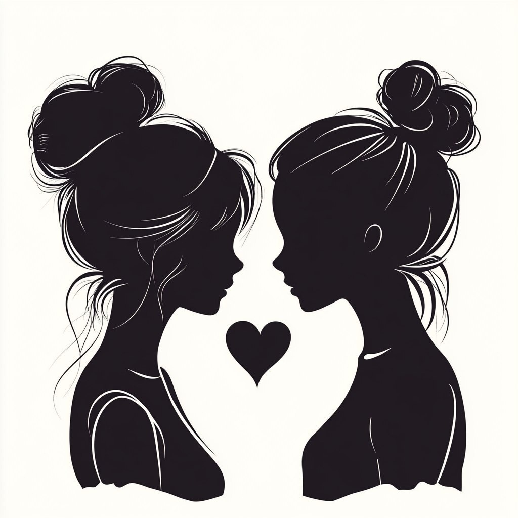 Создано на основе запроса: a black silhouette of a mother and daughter facing each other with a heart between them, flowing long hair and a