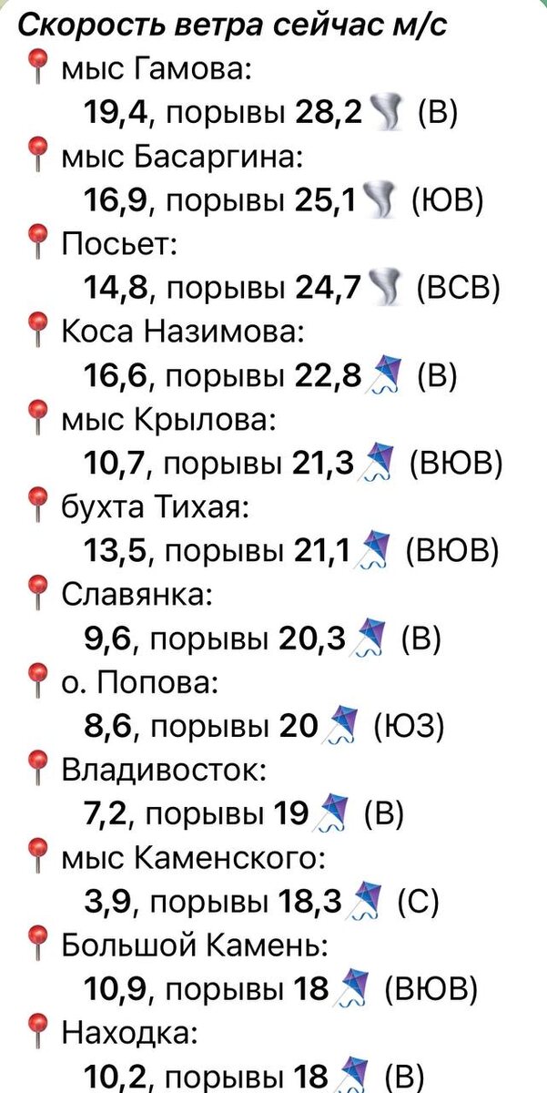 Так, на мысе Басаргина датчики фиксируют порывы до 30 м/с, во Владивостоке тоже штормовые показатели - 20 м/с.