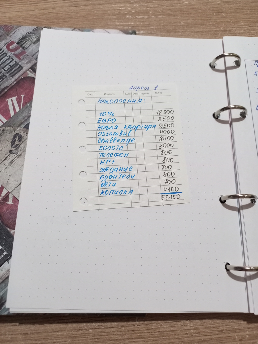 На 6 апреля в моих конвертах накопилось 85.750₽. Накопительная часть составляет 53.150₽. Тратная часть - 26.200₽. Также были расходы - 6.400₽ С учетом расходов, остаток - 79.350₽. На накопительном счету - 100.000₽.
