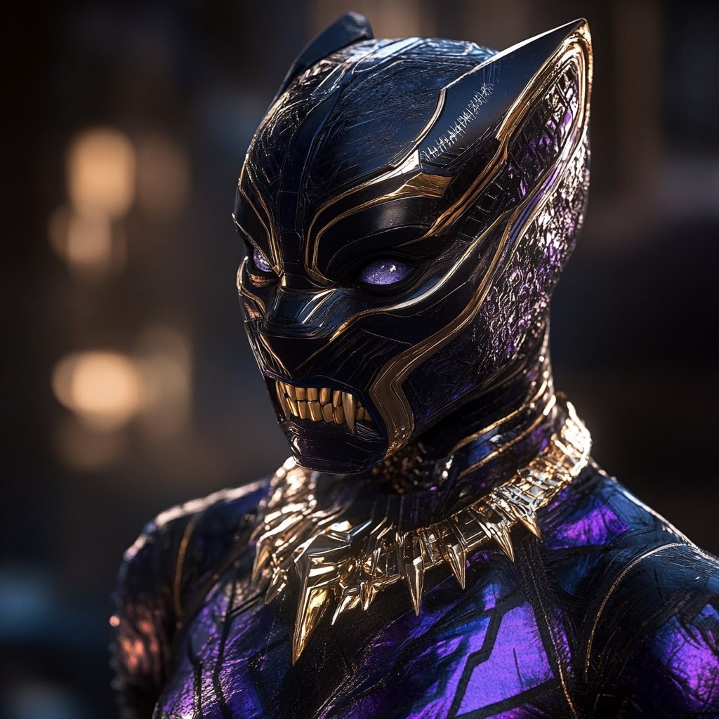 Создано на основе запроса: a female black panther suit with a golden teeth necklace and a purple and black cape down her back --- Автоперевод: Женский костюм Черной пантеры с ожерельем с золотыми зубами и фиолетовым и черным плащом вниз по ее спине Как тебе иллюстрация? 🤔 https://dzen.ru/id/65c0c65c86e4f837c27b24d7 #ИИ #AI #нейросеть #midjourney #art