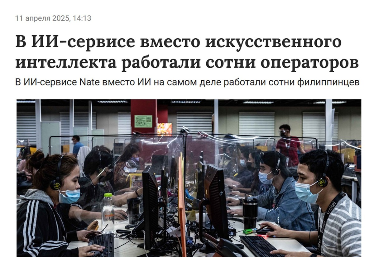 В США один стартап в области искусственного интеллекта раскрыл свой секрет: за его работой стояла группа из ста филиппинцев. Сервис Nate предоставлял пользователям возможность автоматически совершать покупки из любых онлайн-магазинов. Пользователь просто отправлял ссылку на товар, а "алгоритмы" выполняли покупку. Однако настоящими "алгоритмами" оказались не машины, а множество бедных работников из Азии. Наш уютный канальчик 🤖 Анимация | СhatGPT-4 | Помощь с резюме
