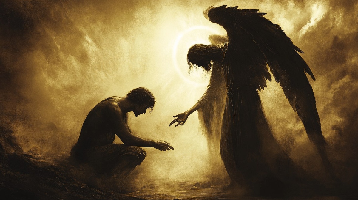 Создано на основе запроса: A sorrowful Michael faces a kneeling fallen angel in tattered robes, wings darkened and broken