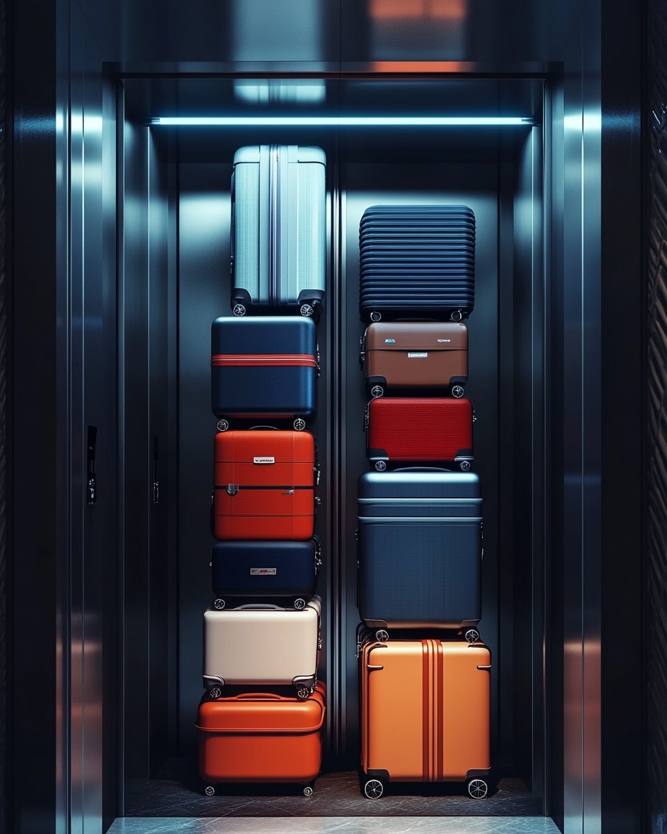 Создано на основе запроса: A collection of various luggages inside a modern elevator, different sizes and colors, some with wheels, stacked