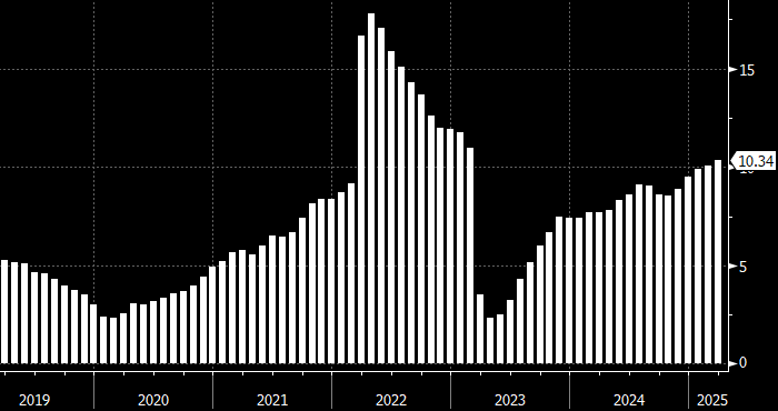 Таков базовый сценарий Bloomberg Economics, в котором тренд на замедление инфляция в РФ продолжится. Однако это не гарантировано: плохой урожай, эскалация конфликта между Россией и Украиной или масштабное снижение цен на нефть могут оказать давление на рубль и подтолкнуть инфляцию вверх. Россия: Индекс потребительских цен (% г/г) Рост цен на транспортные услуги способствовал ускорению потребительской инфляции в России в марте, однако это не сломило общего тренда на ее замедление. Свежие данные указывают на то, что в I кв. инфляция, вероятно, оказалась ниже прогнозов ЦБ, что создает предпосылки для дальнейшего замедления к концу года до 6,5–7,5% с 9,9% по состоянию на конец 2024 года. Ослабления ценового давления, вероятно, окажется недостаточно для того, чтобы Банк России снизил ключевую ставку с текущих 21% на апрельском заседании. Тем не менее мы полагаем, что регулятор пошлет «голубиный» сигнал, который будет означать перспективы снижения ставки на 200–300 б.п. (до 19–18% — прим.) в