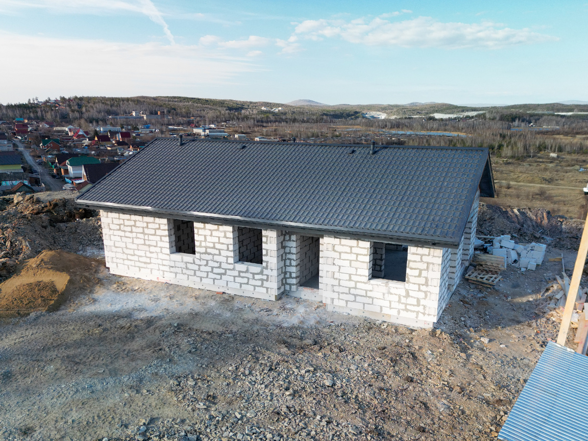 На объекте в Миассе работа идет полным ходом — дом активно возводится! Совсем недавно завершился монтаж кровли.