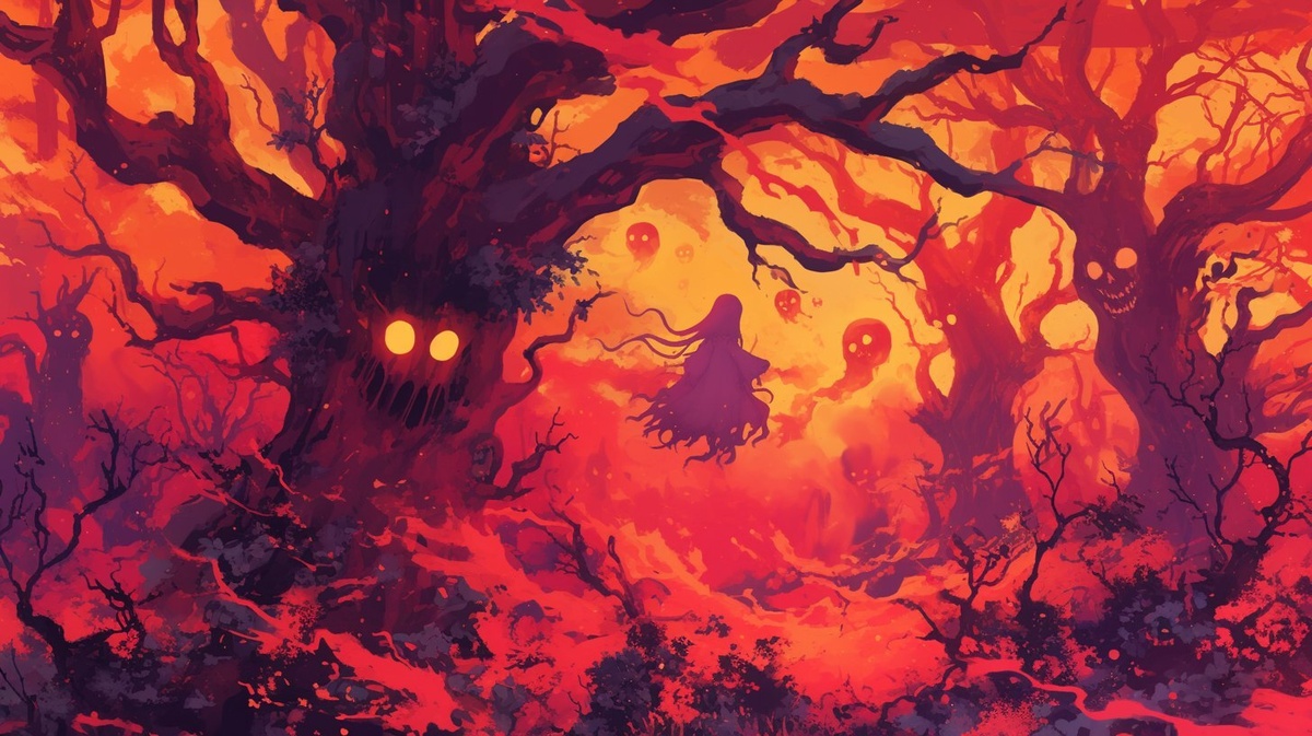 Создано на основе запроса: A dead crimson forest haunted by enraged elemental spirits, cartoon illustration style, furious spirits floating