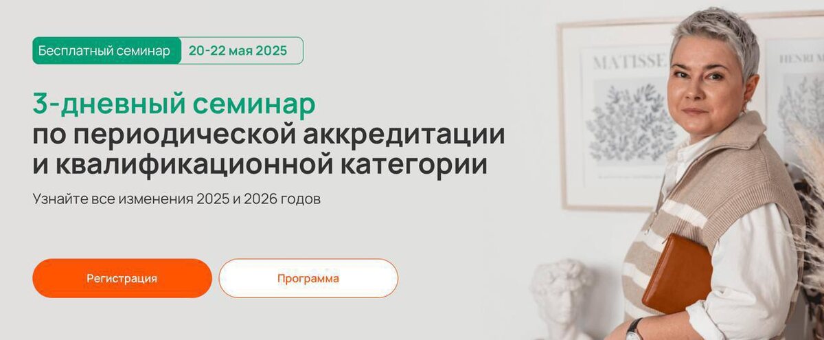 3-дневный семинар по изменениям в аккредитации и отмене дистанционного обучения с 2025 года. Старт 20 мая! Вас ждут целых три дня полезных вебинаров и материалов, в которых мы детально проанализируем все изменения этого года и составим план подготовки к периодической аккредитации. Разберем ошибки на реальных примерах из практики учебного центра Медиатор. @nmo_akkred Даты: 20, 21, 22 мая Регистрация на курс: https://mediator-med.ru/seminar Семинары проведет руководитель методического отдела Наталья Купкина. Мы поделимся практикой, ведь с нами прошли аккредитацию более 6000 специалистов. Ежемесячно программы обучения в нашем центре проходят свыше 500 специалистов. Рекомендуем семинар всем медицинским и фармацевтическим специалистам, руководителям и кадровым службам. Темы семинаров ► 20 мая. Особенности периодической аккредитации с 2025 года. Отмена дистанционного обучения и как это повлияет на все процессы. ► 21 мая. Портфолио для периодической аккредитации. На что стали