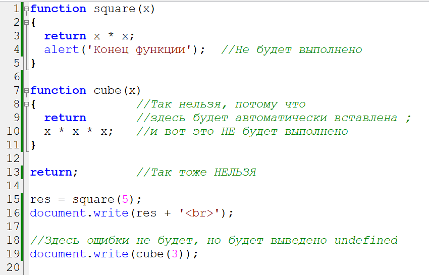 Как видите, если после return будет перевод строки, то это будет работать также, как будто после return нет выражения. Поэтому такая функция вернёт не результат какого-то выражения (оно не будет вычислено), а undefined. Так что случайный перевод строки в таком неподходящем месте может привести к труднонаходимой ошибке, поскольку с точки зрения синтаксиса здесь всё правильно, и сценарий будет работать.