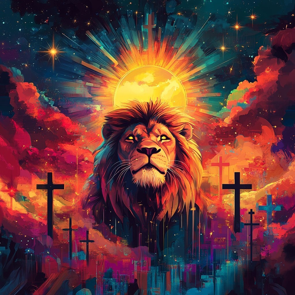 Создано на основе запроса: Illustration of the lion of Judah, crosses in background, stars, beautiful image