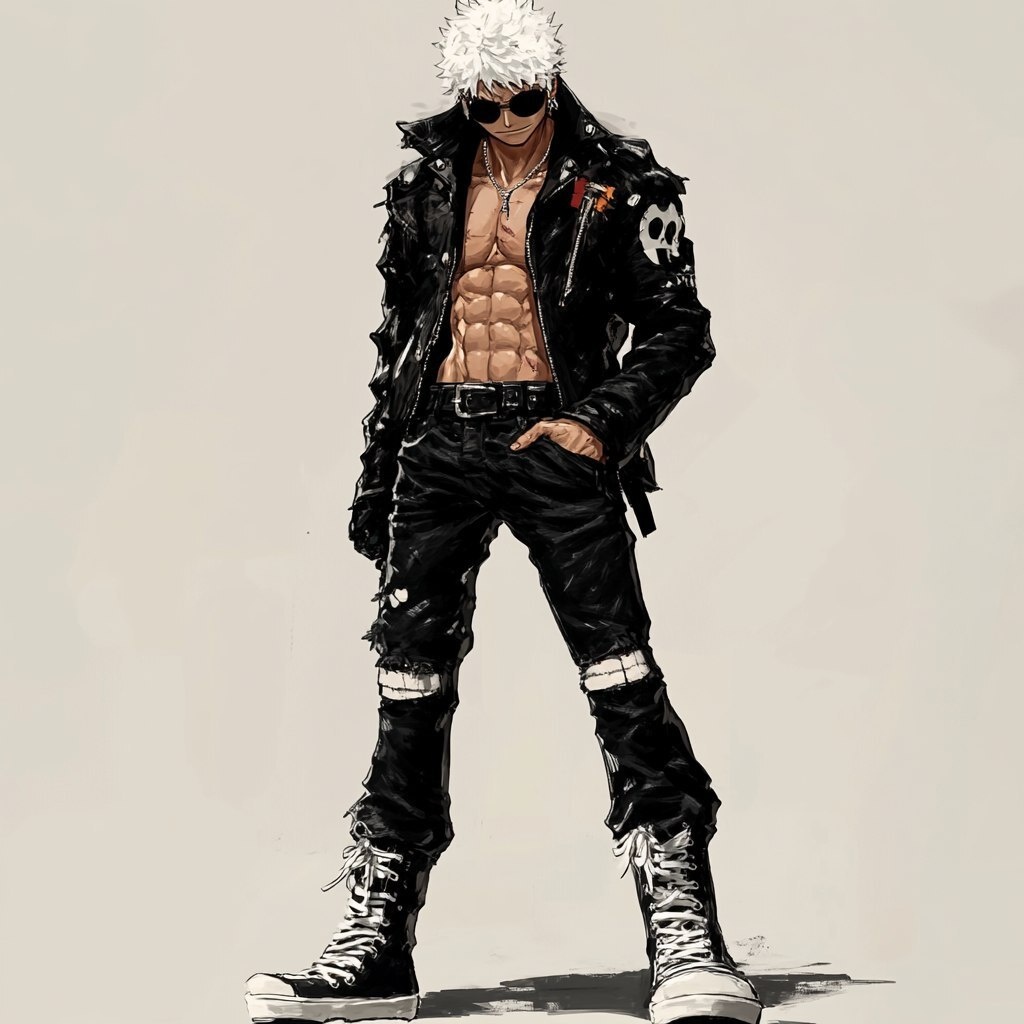 Создано на основе запроса: King from One Piece, tall, muscular, in black Mad Max style leather jacket, black jeans, thigh high chuck taylor