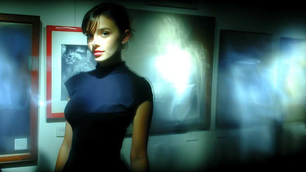 Создано на основе запроса: film noir, dark surrealism, Hollywood starlet in 1960 in an upscale art gallery