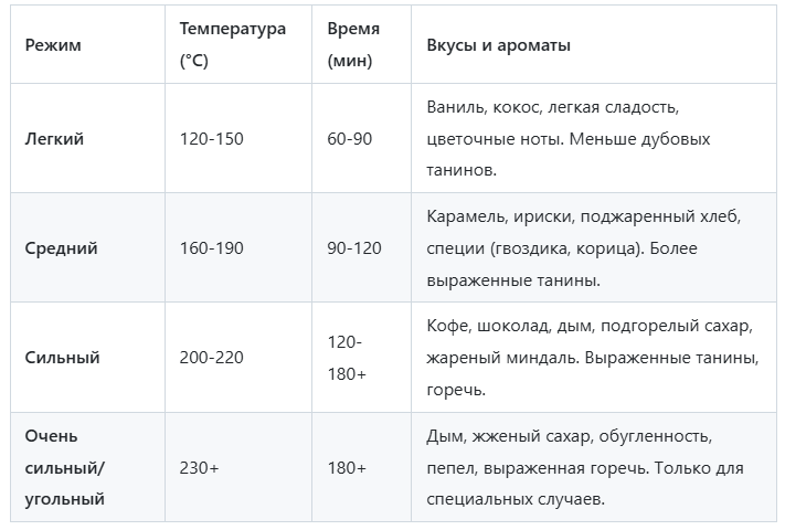 - Очень сильный/Угольный обжиг (230+°C):Вкусы: Преобладают дымные и жженые ноты, появляется обугленность и пепел. Танины очень агрессивные, горечь выражена. Требует осторожного использования.
