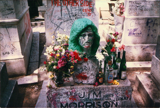 Джим Моррисон (The Doors) Могила Джима Моррисона на знаменитом парижском кладбище Пер-Лашез стала настоящей Меккой для поклонников The Doors. Вокруг надгробия часто оставляют цветы, записи с песнями группы, личные послания и даже рисунки. А порой рисунки оставляют и на самом надгробии – его не раз разрисовывали граффити, а на подходах к могиле чертили стрелки с указанием «Джим». И хотя работники кладбища регулярно их стирают, надписи появляются снова и снова. В 1970-х на надгробии поставили бюст музыканта, но фанаты разрисовали и его. А после того, как на 20-летие смерти музыканта поклонники устроили на кладбище настоящий бунт, администрации пришлось выделить дополнительную охрану, которая персонально дежурит у могилы Моррисона.