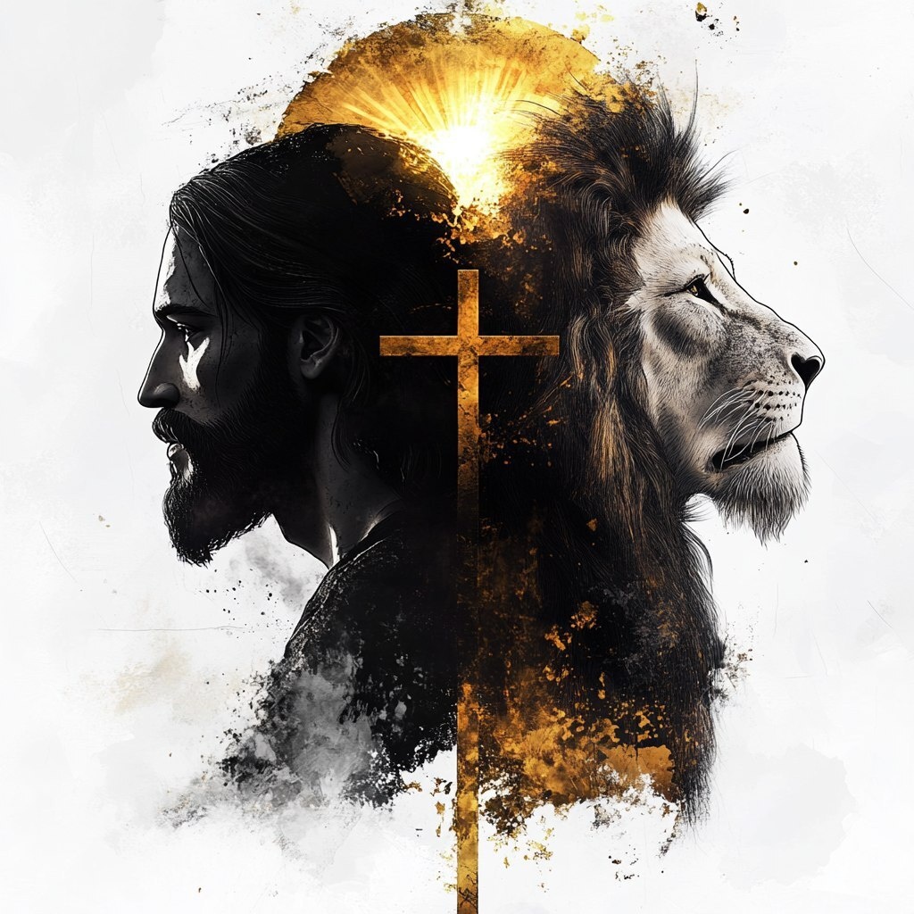 Создано на основе запроса: Illustration of a dark profile of Jesus and the lion of Judah back to back, white background, crosses in