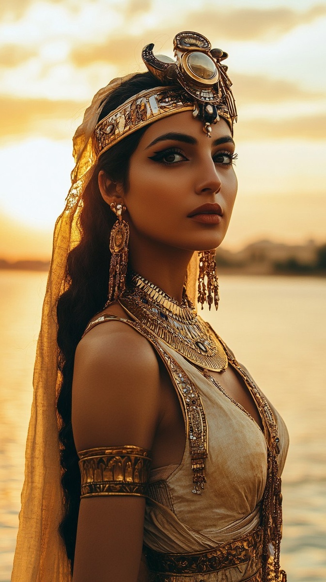 Создано на основе запроса: A regal portrait of Cleopatra standing by the golden Nile River at sunset, wearing an elegant Egyptian dress and