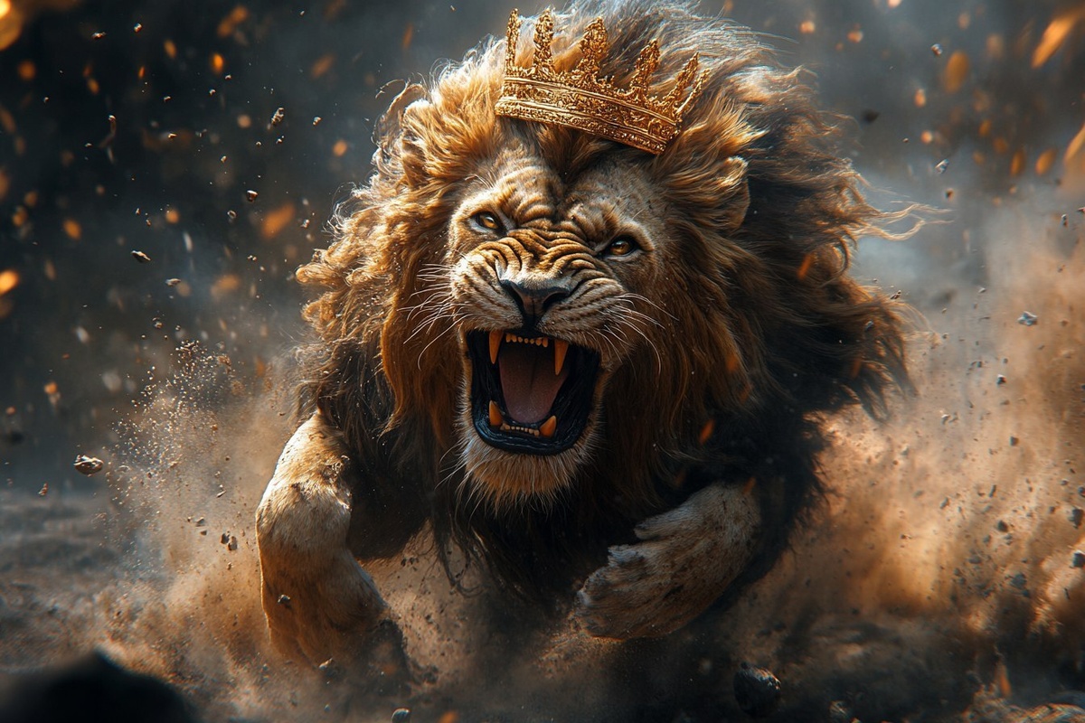 Создано на основе запроса: Natural lion running forward with golden crown on his head, roaring and scar on his face, dust and rocks lifting