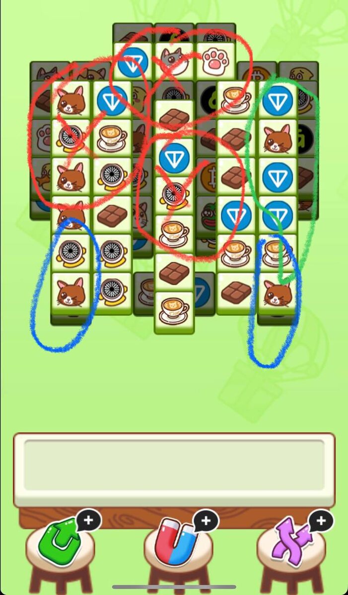 Как побеждать в 🪙 Cattea 13 апреля? 1) Наша главная цель сегодня - это красная зона сверху, по центру и слева. Разбираем красную зону в количестве 17 триплетов, далее подключаем Синие зоны. 2) После разбора 17 триплетов, подключаем синие зоны. Разбираем в соотношении 2 к 1 - 2 карты из красной зоны, 1 из синей зоны. 3) Зеленая зона сегодня справа, старайтесь держать зеленую зону до поздней игры. Всем удачи!