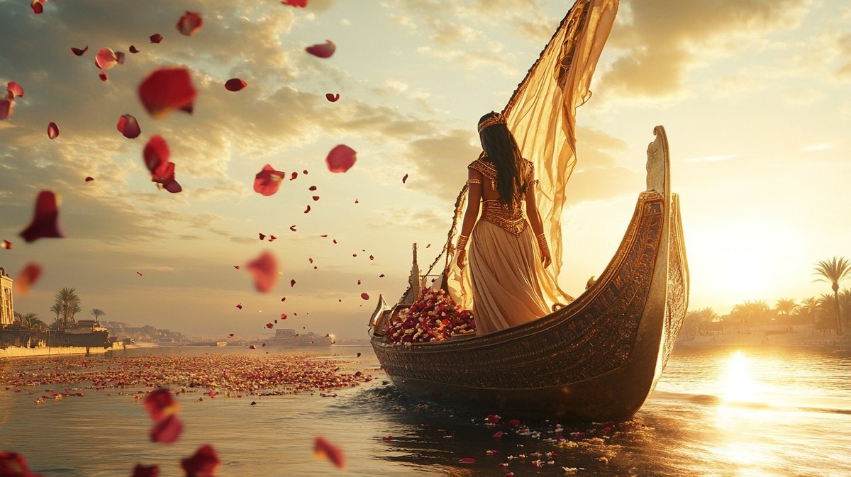 Создано на основе запроса: A luxurious ancient Egyptian boat sailing on the Nile River at sunset, with Cleopatra surrounded by flower petals