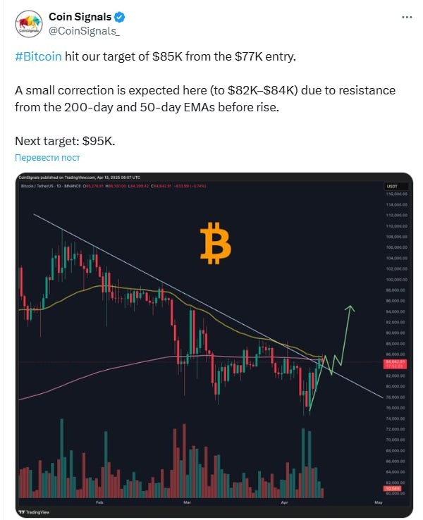 Биткоин достиг цели в $85 тыс. с точки входа $77 тыс. Здесь ожидается небольшая коррекция (до $82 тыс.–$84 тыс.) из-за сопротивления 200-дневной и 50-дневной EMA перед ростом. Следующая цель: $95 тыс.