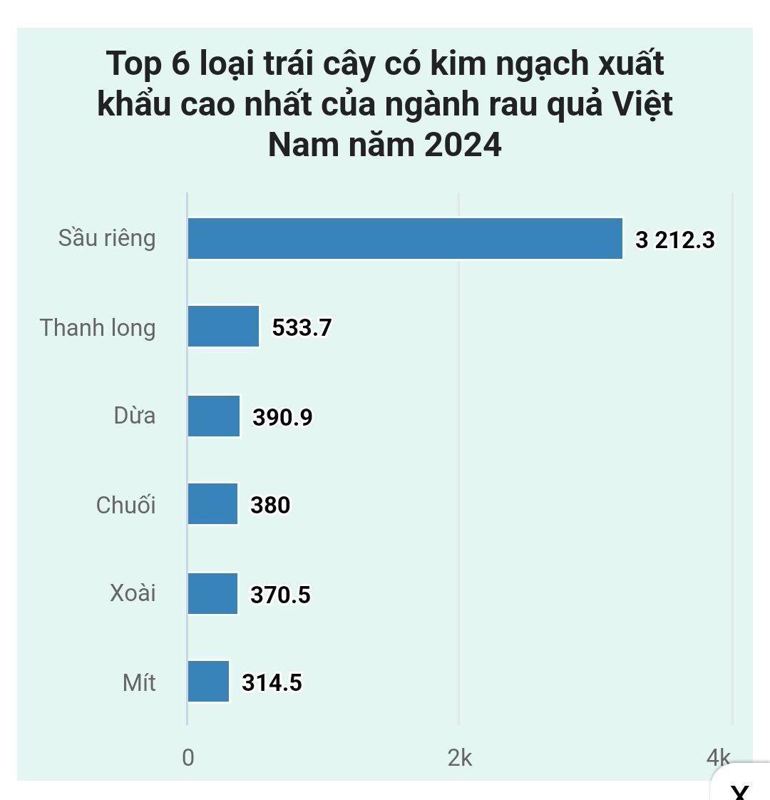 Топ-6 фруктов Вьетнама с наибольшим объемом экспорта в 2024 году** (Данные в миллионах долларов США) - Дуриан: 3212.3 - Драгон фрукт (питахайя): 533.7 - Кокос: 390.9 - Бананы: 380 - Манго: 370.5 - Джекфрут: 314.5 @exportruvn
