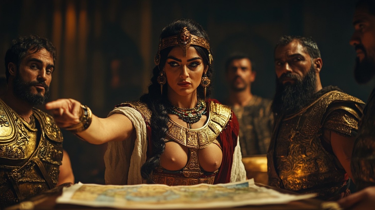 Создано на основе запроса: Cleopatra in a Roman war council scene, confidently pointing at a map surrounded by surprised generals, wearing