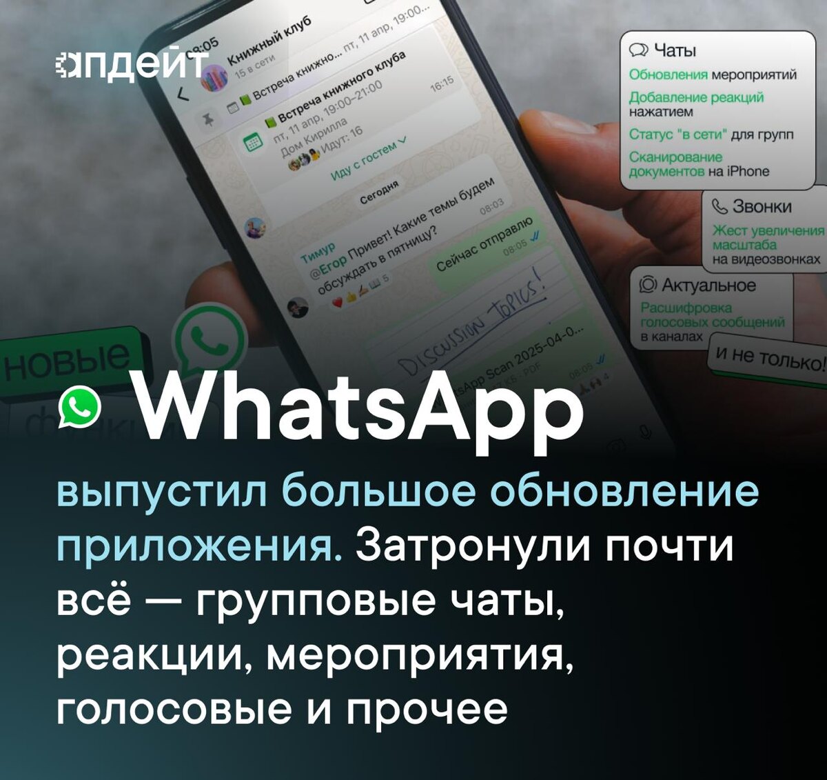 💬Большая обнова у «зеленых» WhatsApp представил новые функции. Обо всех по порядку: — Групповые чаты: индикатор «Онлайн» (количество активных участников без имён) и настройка уведомлений («все» или «основные» — @упоминания, ответы, сообщения от контактов). — Каналы: видео до 60 секунд, QR-коды для подписки, расшифровка голосовых сообщений. — Мероприятия: создание не только в групповых чатах, но и в личных, добавили реакцию «возможно», приглашение +1, указание даты/времени окончания, закрепление в чате. — Реакции: обновили дизайн, стиль как в Telegram — отображение с фото пользователя, возможность повторить или выбрать другую реакцию. — Сканирование документов (iOS): прямо из меню вложений с обрезкой и отправкой. — Приложение по умолчанию (iOS): WhatsApp можно сделать основным для звонков и сообщений. — Видеозвонки: улучшено качество и стабильность, на iPhone добавлен зум пальцами. Большинство функций уже доступны, остальные появятся скоро. ⚡️ Подписаться.
