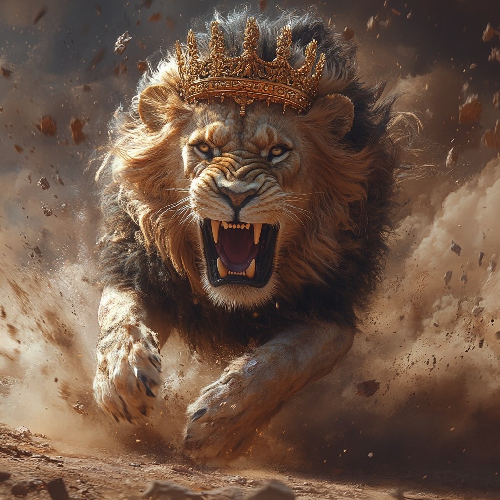 Создано на основе запроса: A fierce lion with its mouth open, roaring and wearing an ancient golden crown, is running on the ground surrounded by flying dust and debris. The background features a dusty brown landscape, creating a cinematic atmosphere. --- Автоперевод: Ожесточенный лев с открытым ртом, рев и ношения древней золотой короны, бежит по земле, окруженной летающей пылью и мусором. Что думаешь? 🤔 https://dzen.ru/id/65c0c65c86e4f837c27b24d7 #ИИ #AI #нейросеть #midjourney #art