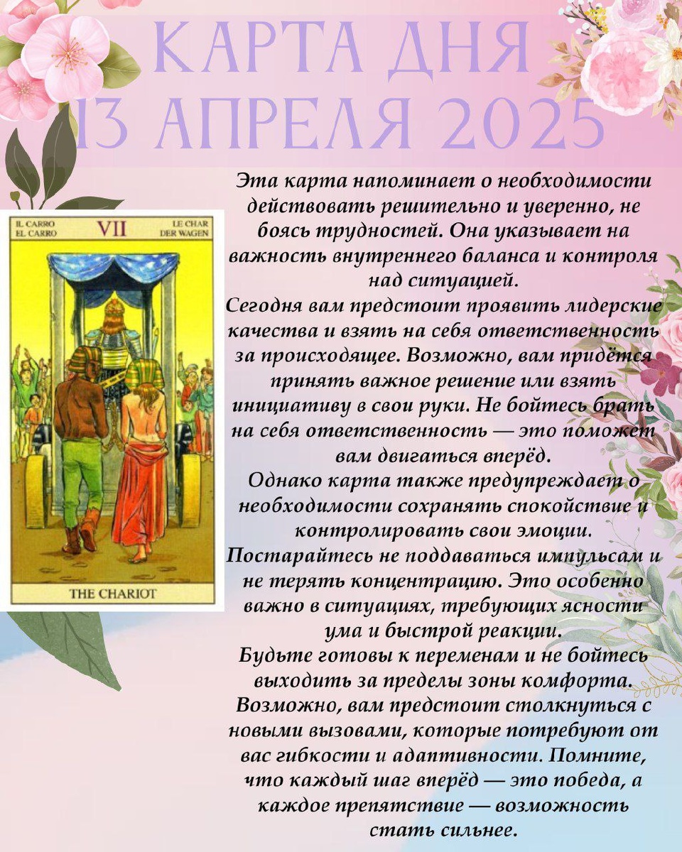 Сегодня вам предстоит проявить лидерские качества и взять на себя ответственность за происходящее. Возможно, вам придётся принять важное решение или взять инициативу в свои руки. Не бойтесь брать на себя ответственность — это поможет вам двигаться вперёд. Однако карта также предупреждает о необходимости сохранять спокойствие и контролировать свои эмоции. Постарайтесь не поддаваться импульсам и не терять концентрацию. Это особенно важно в ситуациях, требующих ясности ума и быстрой реакции. Будьте готовы к переменам и не бойтесь выходить за пределы зоны комфорта. Возможно, вам предстоит столкнуться с новыми вызовами, которые потребуют от вас гибкости и адаптивности. Помните, что каждый шаг вперёд — это победа, а каждое препятствие — возможность стать сильнее.