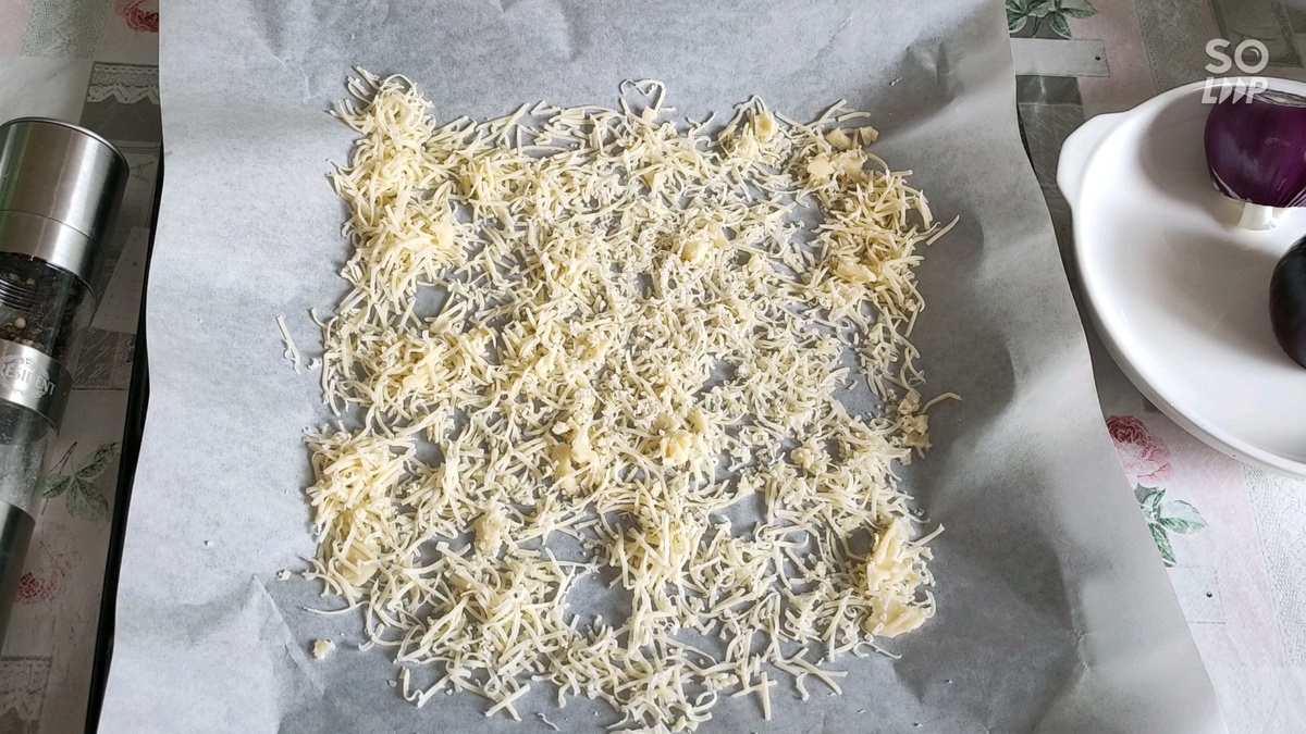 На противень, застеленной пергаментной бумагой, натереть половину сыра
