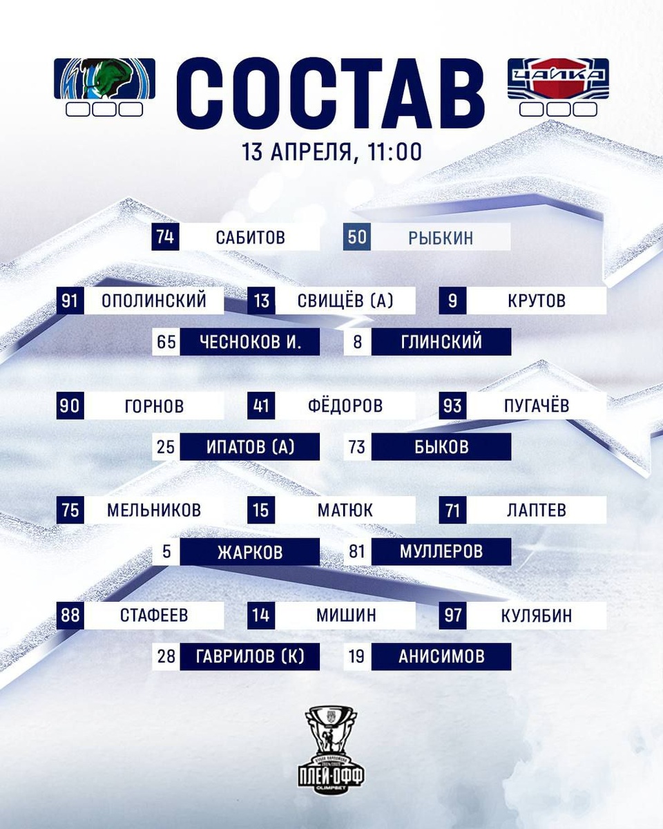 В 11.00 по московскому времени в ледовом дворце спорта Ханты-Мансийска начнется первый матч четвертьфинальной серии между «Мамонтами Югры» и «Чайкой». Знакомимся с составом нашей команды на игру. После отсутствия по причине травмы возвращается в состав Степан Горнов #90 (для которого последняя игра в составе команды была как раз против «Мамонтов» 25 февраля). Болеем за ребят и желаем им успеха! Прямая трансляция матча ЗДЕСЬ.