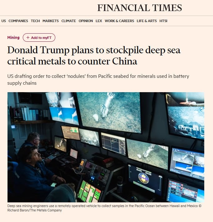 Британская Financial Times посвятила обстоятельный материал планам США добывать редкоземельные металлы со дна океана. По данным газеты, администрация Дональда Трампа готовит указ, который позволит добывать металлы, найденный на дне Тихого океана, чтобы противостоять доминированию Китая на рынке минералов для аккумуляторов и редкоземельных металлов, сообщили люди, знакомые с этим вопросом. «В конкрециях размером с картофелину, которые образуются на морском дне под высоким давлением в течение миллионов лет, содержатся никель, кобальт, медь и марганец, используемые в аккумуляторах, электропроводке или боеприпасах, а также следы редкоземельных минералов. Они могут быть добавлены в существующие федеральные запасы сырой нефти и металлов», – говорится в публикации. Отмечается, что США стремятся стать самодостаточными в этих критически важных минералах. Параллельно с этим администрация Трампа давит на Украину для заключения соглашения о добыче полезных ископаемых на ее территории, угрожает зах