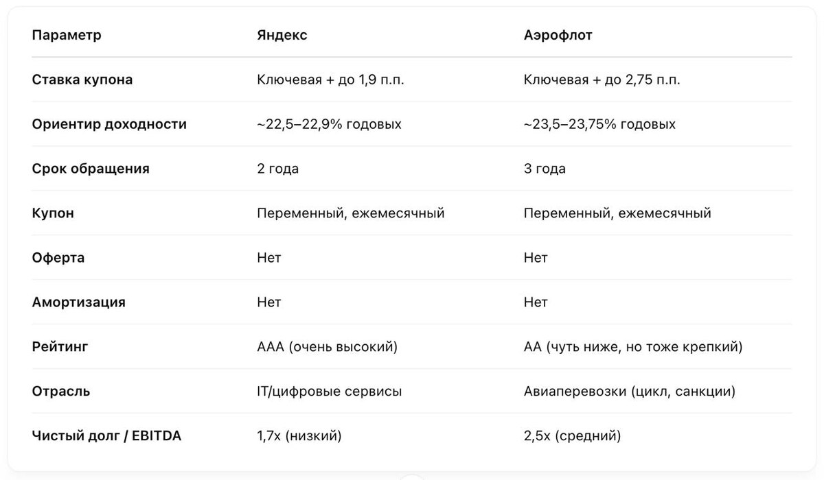 Что думаю по новым бондам. На рынок выходят сразу два интересных размещения, оба с переменным купоном, оба на слуху: 1. Аэрофлот — до 23,75% годовых, но есть нюансы: нет оферты, ставка плавающая, а отрасль не самая простая 2. Яндекс — до 22,9%, рейтинг AAA, IT-гигант, но ставка тоже не фикс Разобрал оба — просто факты, цифры, выводы и немного моего мнения. Это все можно прочитать тут: 👉 Облигации Аэрофлота и Облигации Яндекса. Если такой формат заходит — жми 👍 Если нет — 👎 тоже принимается, я не обижусь 😉