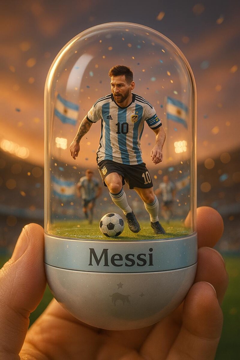 A highly detailed transparent gashapon capsule shape diorama is held delicately between index finger and thumb, featuring {описание персонажа} – inside the capsule: {описание одежды стадиона, движение} – capsule design: {описание капсулы и текста} – cinematic lighting, miniature scale, diorama aesthetic, ultra-detailed with soft bokeh background, motion elements, soft focus, portrait ratio, photo-realistic