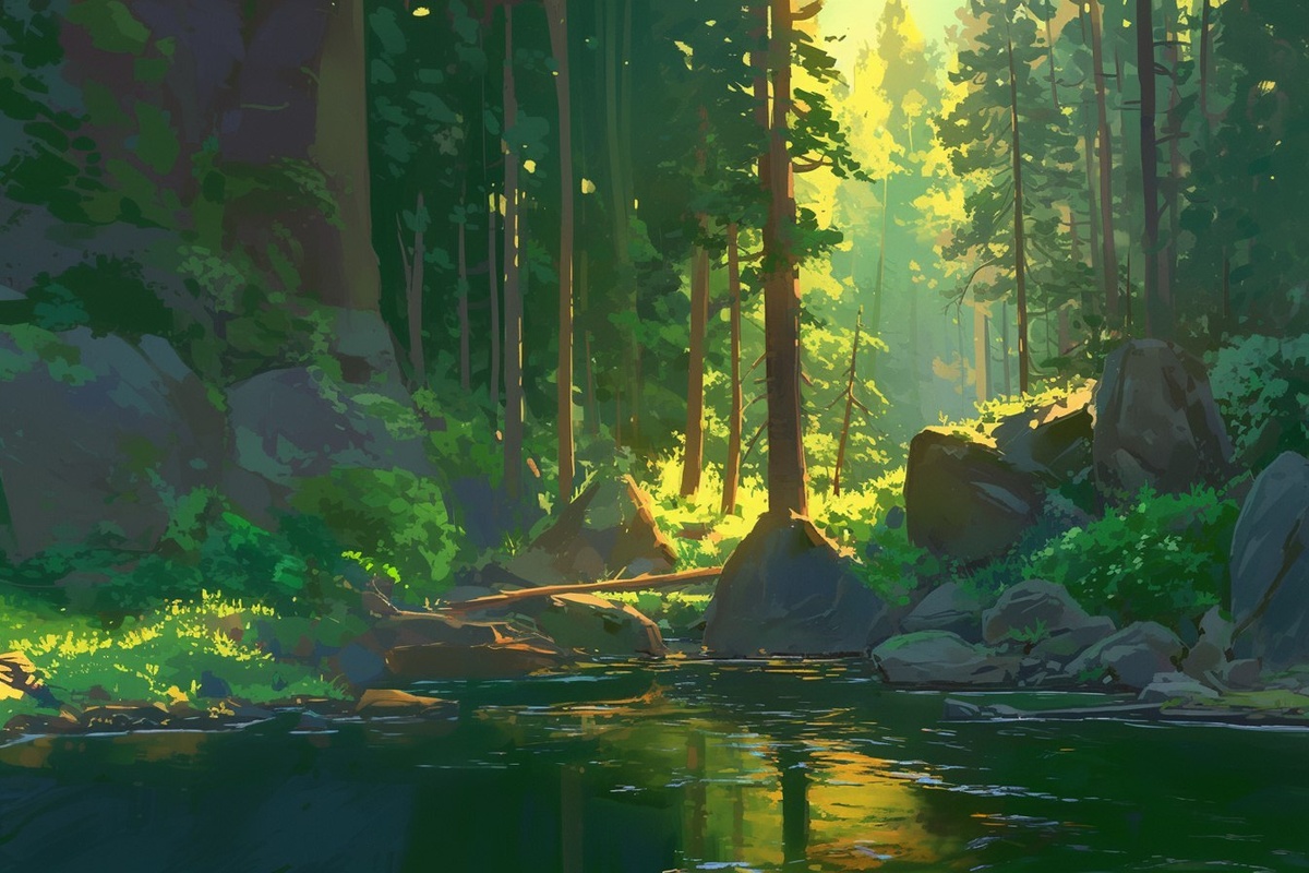 Создано на основе запроса: beautiful forest pine trees, sunlight, river