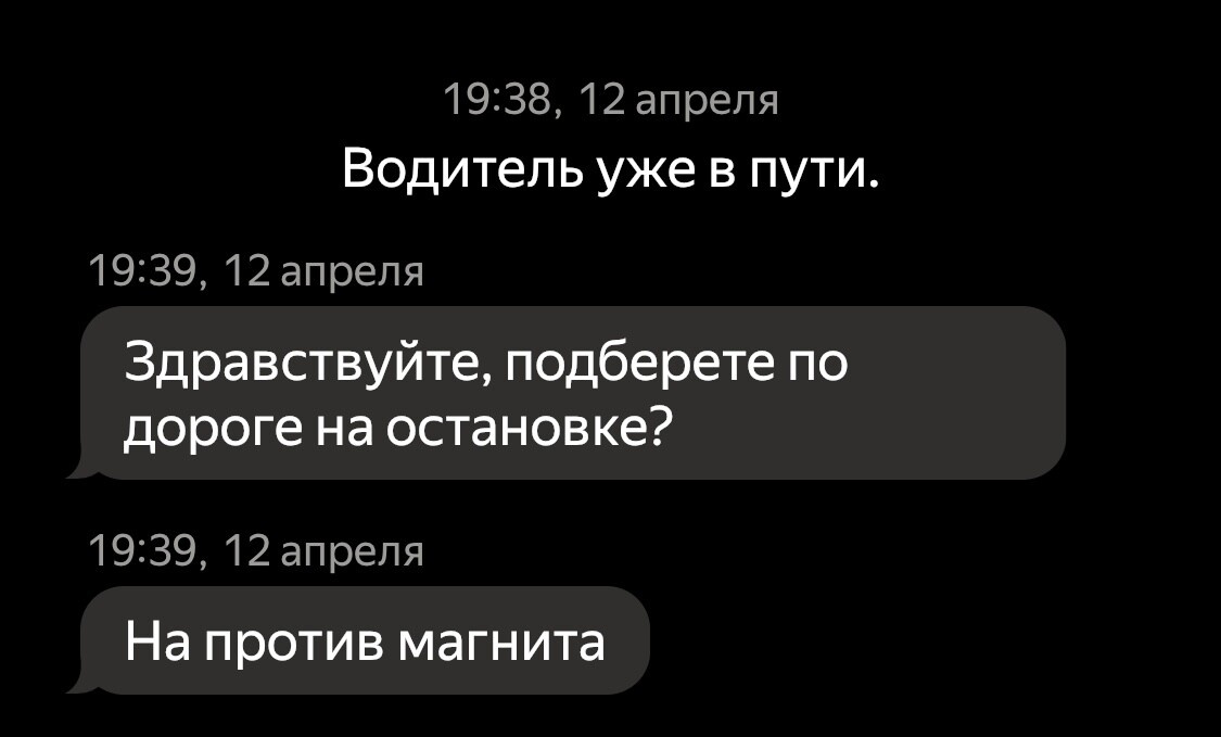 - ВО-ПЕРВЫХ, СООБЩЕНИЕ С ВАШЕГО ЗАКАЗА ПРИДЁТ НЕ РАНЬШЕ, ЧЕМ Я ЗАВЕРШУ ПРЕДЫДУЩИЙ, ПОНЯТНО?! МОЖЕТЕ СКОЛЬКО УГОДНО ПИСАТЬ, ВОДИТЕЛЬ УВИДИТ ТОЛЬКО ТОГДА, КОГДА ОТВЕЗЁТ ПЕРВОГО ПАССАЖИРА!