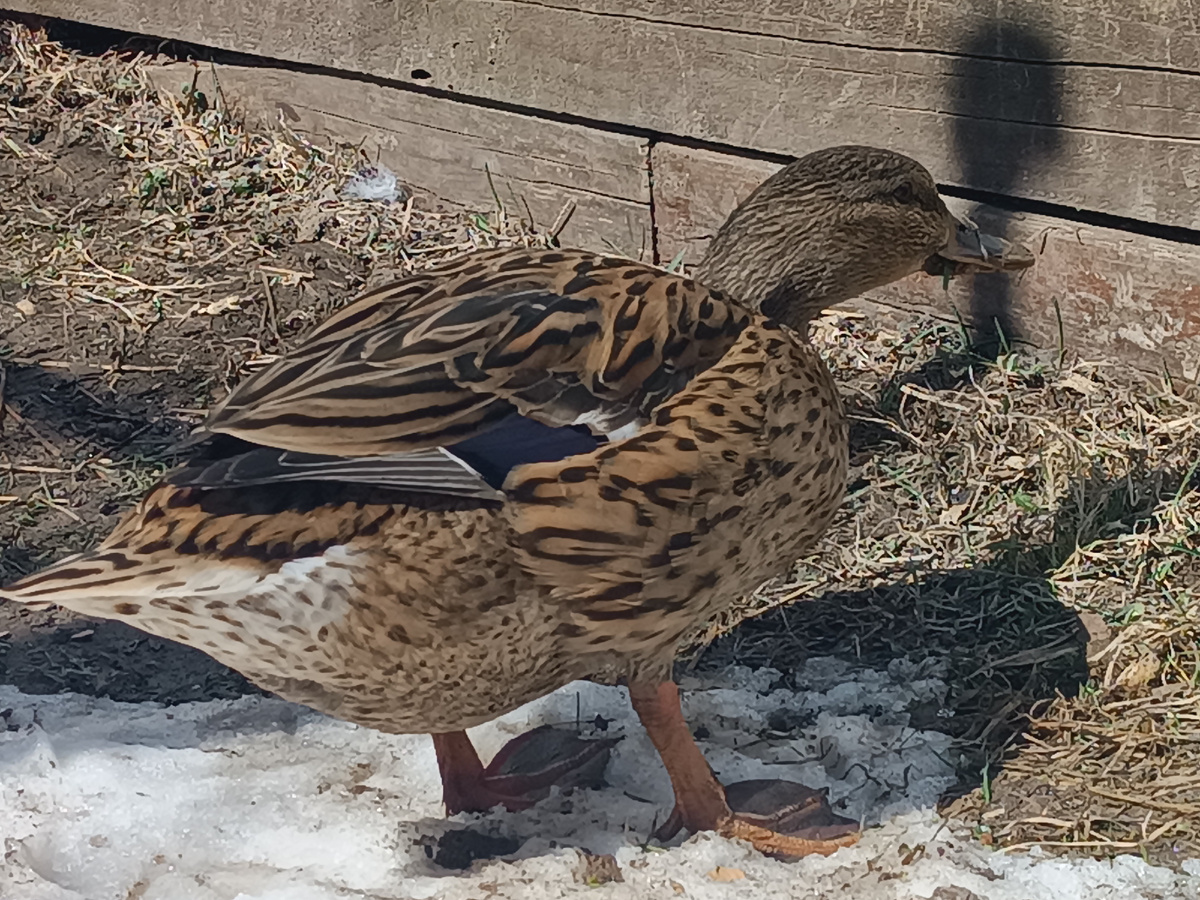 В этом году будет шесть лет нашей деревенской жизни. Жизнь эта уже давно течет спокойно и размеренно, иногда разбавляясь различными природными, погодными и прочими катаклизмами, ну так никто не обещал, что будет легко)) Наш птичий двор тоже довольно стабилен последние пару лет - куры, гуси и цесарки заметно оживляют спокойную деревенскую жизнь, радуя нас натурпродуктом и беся соседей своими жизнерадостными криками. Поздней осенью в местном чате появилось сообщение о блуждающей бесхозной утке, которая по свежевыпавшему, уже довольно глубокому снегу штурмует дачи в поисках еды. Поскольку всех немногих птицеводов в округе я знаю, а уток никто не держит, стало интересно, и я отправилась по указанному адресу. "Потерявшаяся" утка оказалась дикой кряквой, по какой- то причине не улетевшая со своими сородичами. Почему не улетела, и как оказалась практически не летающая птица вдали от водоемов, так и осталось загадкой. К моему приходу утю уже выловили и представили, как не летающую совсем.