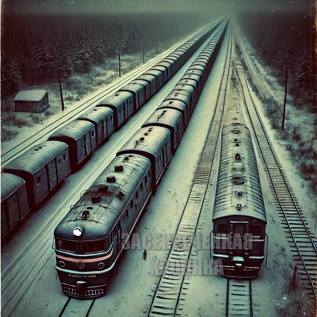 Вышел на улицу. Мороз — минус тридцать, может больше. Пар валит изо рта, не успевая замерзнуть. И тут — огни. Глухо и неторопливо, состав выходит из-за сопки. Локомотив — серый, без номеров, как будто только с консервации. Чистый, но старый. Вагоны — крытые, одинаковые, длинные, как мясные рефрижераторы, но без маркировки. Ни "РЖД", ни "Армия", ни даже грузового номера. Просто глухие ящики на колёсах. Пятьдесят восемь штук, я потом пересчитал.