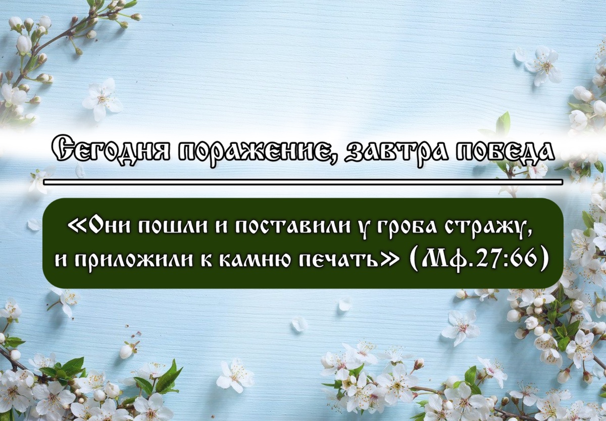 Часто кажется и нам, что наша вера поругана, побеждена... Голос Божий не раздается, мы его не слышим при совершающемся беззаконии; свет застилается густым мраком, грубая вражья сила побеждает справедливость и правду. В унынии, с болью в сердце, апостолы Христа недоумевают – почему Учитель их дал прикрыть Себя могильным камнем?