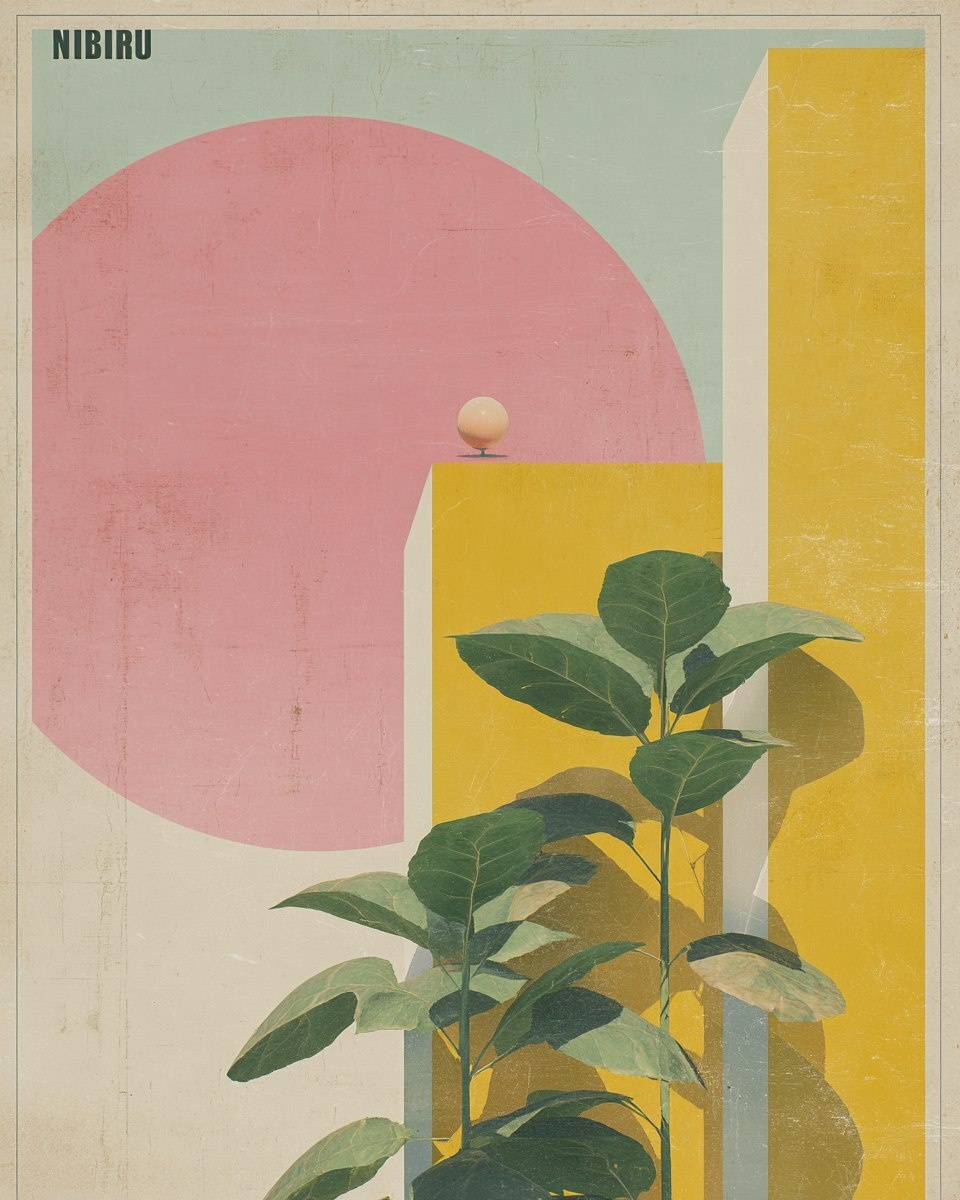 Создано на основе запроса: Retro Italian advertisement poster featuring "NIBIRU", pink, yellow, leaf green