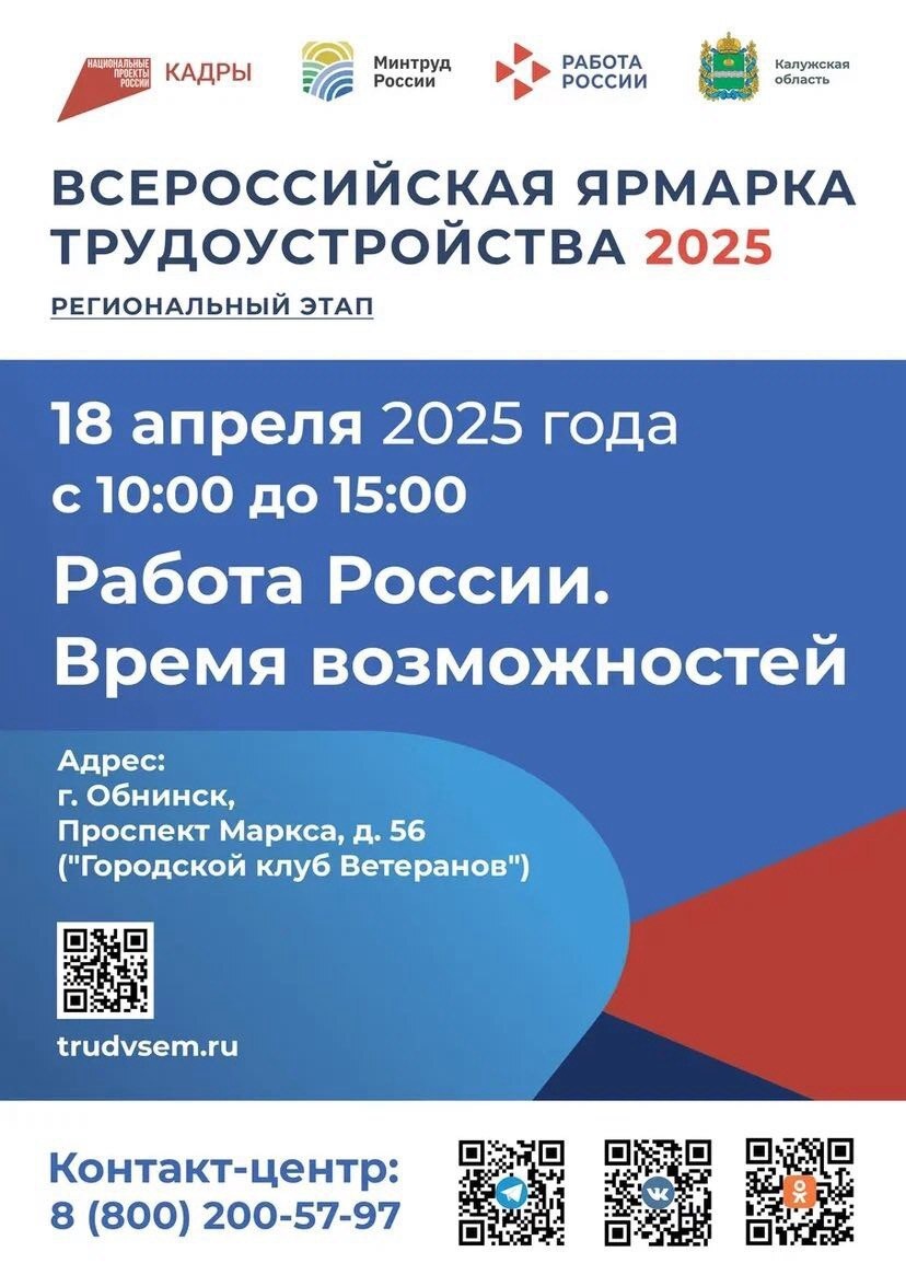 Найдите работу своей мечты на ярмарке вакансий! 18 апреля с 10:00 до 15:00 в Городском клубе ветеранов пройдёт региональный этап Всероссийской ярмарки вакансий «Работа России. Время возможностей». Что вас ждёт: ✅ вакансии от 20 организаций, включая ведущие предприятия региона ✅ экспресс-собеседования с работодателями ✅ карьерные консультации и помощь в составлении резюме ✅ информация о профессиональном обучении и дополнительном образовании ✅ тренинги и мастер-классы по развитию карьеры Ярмарка вакансий – это не только поиск работы, но и возможность получить ценные рекомендации, открыть новые горизонты для своего профессионального роста. Приходите и используйте своё «Время возможностей»!